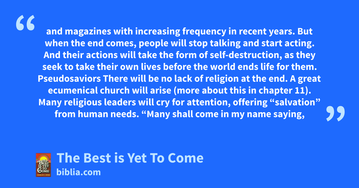 and magazines with increasing frequency in recent years. But when the end comes, people will stop talking and start acting. And their actions will take the form of self-destruction, as they seek to take their own lives before the world ends life for them. Pseudosaviors There will be no lack of religion at the end. A great ecumenical church will arise (more about this in chapter 11). Many religious leaders will cry for attention, offering “salvation” from human needs. “Many shall come in my name saying,