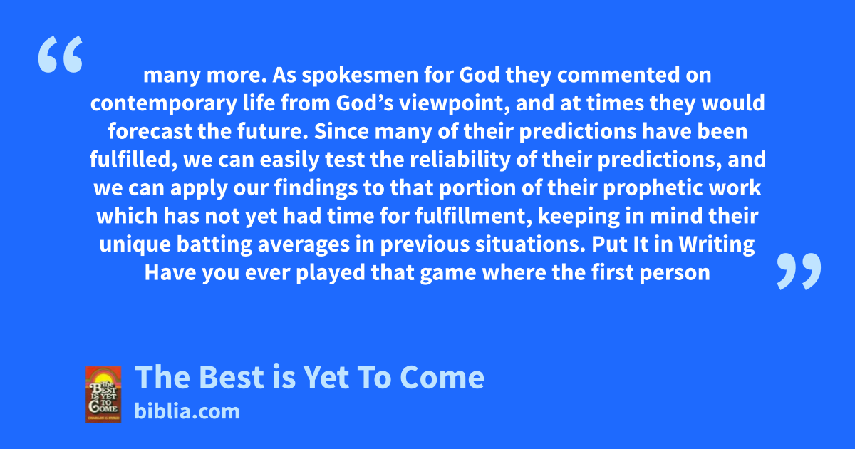 many more. As spokesmen for God they commented on contemporary life from God’s viewpoint, and at times they would forecast the future. Since many of their predictions have been fulfilled, we can easily test the reliability of their predictions, and we can apply our findings to that portion of their prophetic work which has not yet had time for fulfillment, keeping in mind their unique batting averages in previous situations. Put It in Writing Have you ever played that game where the first person