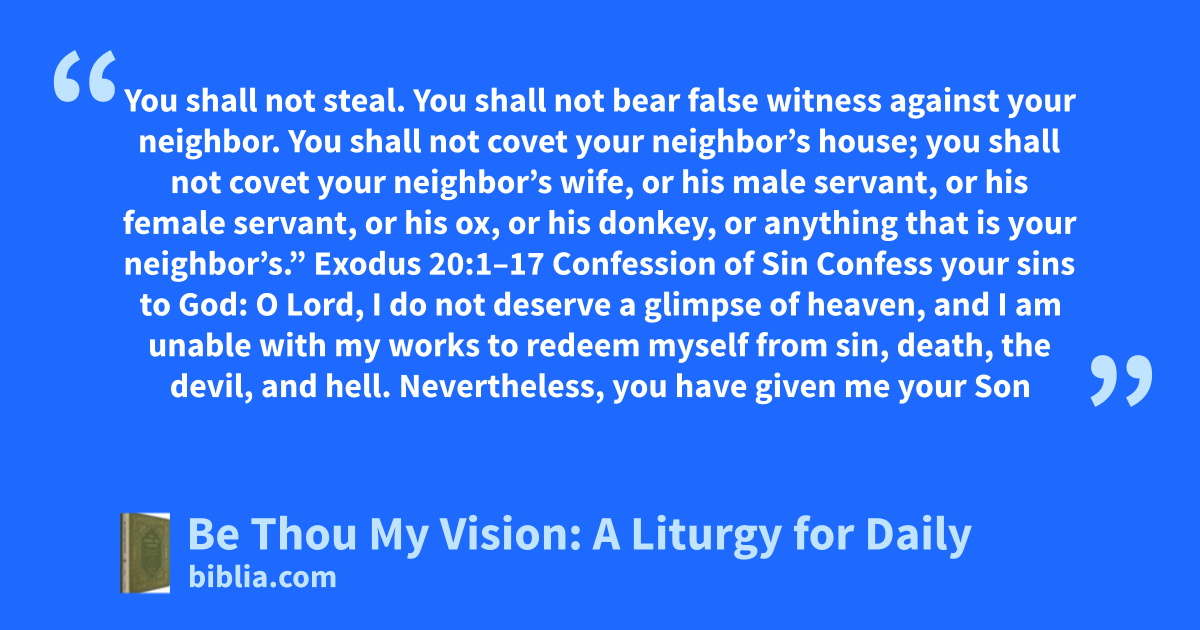 You shall not steal. You shall not bear false witness against your neighbor. You shall not covet your neighbor’s house; you shall not covet your neighbor’s wife, or his male servant, or his female servant, or his ox, or his donkey, or anything that is your neighbor’s.” Exodus 20:1–17 Confession of Sin Confess your sins to God: O Lord, I do not deserve a glimpse of heaven, and I am unable with my works to redeem myself from sin, death, the devil, and hell. Nevertheless, you have given me your Son