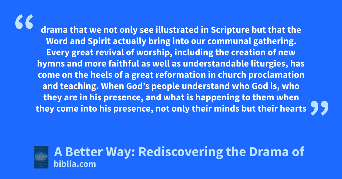 drama that we not only see illustrated in Scripture but that the Word and Spirit actually bring into our communal gathering. Every great revival of worship, including the creation of new hymns and more faithful as well as understandable liturgies, has come on the heels of a great reformation in church proclamation and teaching. When God’s people understand who God is, who they are in his presence, and what is happening to them when they come into his presence, not only their minds but their hearts