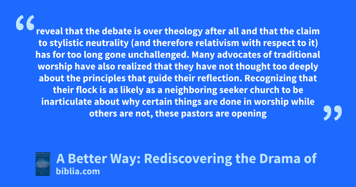 reveal that the debate is over theology after all and that the claim to stylistic neutrality (and therefore relativism with respect to it) has for too long gone unchallenged. Many advocates of traditional worship have also realized that they have not thought too deeply about the principles that guide their reflection. Recognizing that their flock is as likely as a neighboring seeker church to be inarticulate about why certain things are done in worship while others are not, these pastors are opening