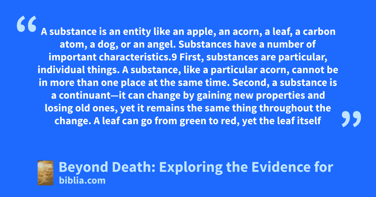 A substance is an entity like an apple, an acorn, a leaf, a carbon atom, a dog, or an angel. Substances have a number of important characteristics.9 First, substances are particular, individual things. A substance, like a particular acorn, cannot be in more than one place at the same time. Second, a substance is a continuant—it can change by gaining new properties and losing old ones, yet it remains the same thing throughout the change. A leaf can go from green to red, yet the leaf itself