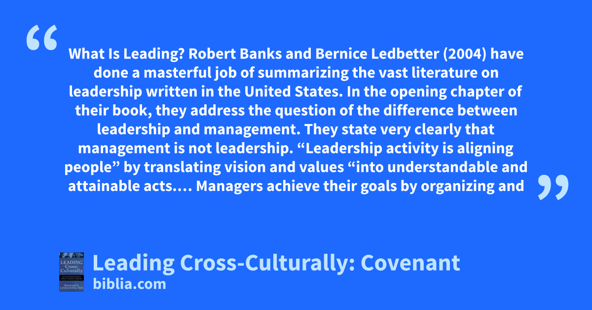 What Is Leading? Robert Banks and Bernice Ledbetter (2004) have done a masterful job of summarizing the vast literature on leadership written in the United States. In the opening chapter of their book, they address the question of the difference between leadership and management. They state very clearly that management is not leadership. “Leadership activity is aligning people” by translating vision and values “into understandable and attainable acts.… Managers achieve their goals by organizing and