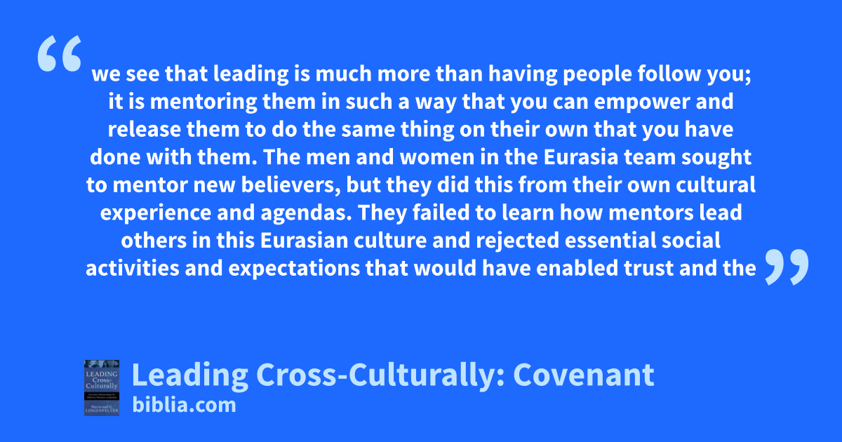 we see that leading is much more than having people follow you; it is mentoring them in such a way that you can empower and release them to do the same thing on their own that you have done with them. The men and women in the Eurasia team sought to mentor new believers, but they did this from their own cultural experience and agendas. They failed to learn how mentors lead others in this Eurasian culture and rejected essential social activities and expectations that would have enabled trust and the
