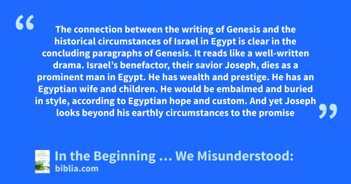 The connection between the writing of Genesis and the historical circumstances of Israel in Egypt is clear in the concluding paragraphs of Genesis. It reads like a well-written drama. Israel’s benefactor, their savior Joseph, dies as a prominent man in Egypt. He has wealth and prestige. He has an Egyptian wife and children. He would be embalmed and buried in style, according to Egyptian hope and custom. And yet Joseph looks beyond his earthly circumstances to the promise