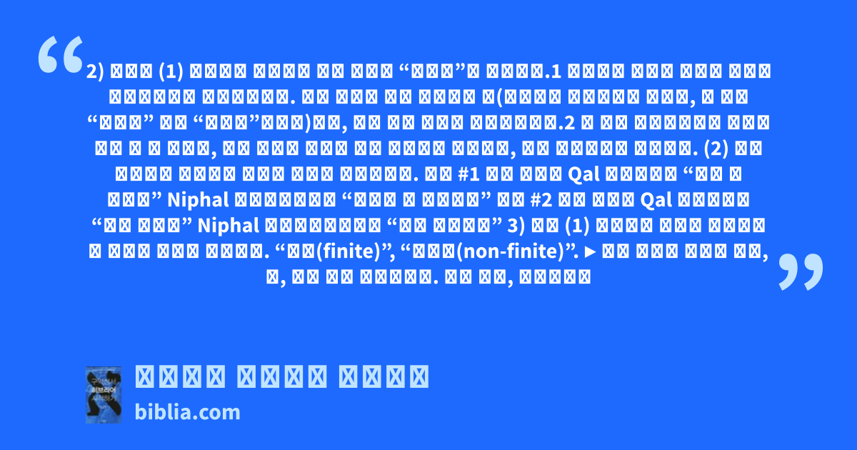 2) 변화형 (1) 히브리어 동사에는 일곱 가지의 “변화형”이 있습니다.1 변화형은 어근에 특별한 요소를 덧붙임으로써 만들어집니다. 이번 과에서 배울 변화형은 칼(히브리어 קָל에서 왔는데, 그 뜻은 “가벼운” 또는 “단순한”입니다)이며, 칼은 단순 능동형 변화형입니다.2 또 다른 변화형으로는 니팔을 예로 들 수 있는데, 이는 어근에 접두어 נ을 덧붙여서 만드는데, 칼의 수동형으로 쓰입니다. (2) 동사 변화형의 변화에서 의미의 변화가 생겨납니다. 보기 #1 어근 זרע Qal זָרַע “그가 씨 뿌렸다” Niphal נִזְרַע “그것이 씨 뿌려졌다” 보기 #2 어근 ספר Qal סָפַר “그가 세었다” Niphal נִסְפַּר “그가 세어졌다” 3) 활용 (1) 히브리어 동사의 활용에는 두 가지의 형태가 있습니다. “정형(finite)”, “비정형(non-finite)”. ▶ 정형 동사의 활용은 인칭, 성, 수에 의해 활용됩니다. 예를 들어, זָרַע