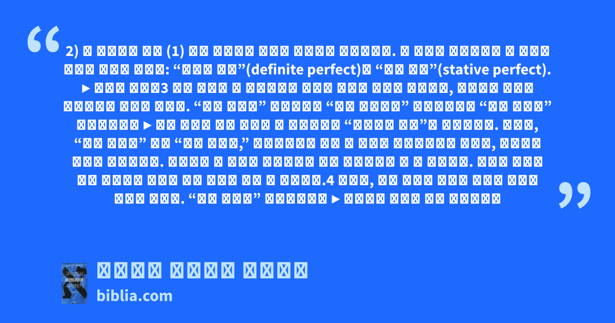 2) 칼 완료형의 용법 (1) 완료 활용형은 다양한 방식으로 사용됩니다. 그 가운데 여기에서는 두 가지의 용법만 소개해 봅니다: “한정적 완료”(definite perfect)와 “상태 완료”(stative perfect). ▶ 한정적 완료는3 동작 동사의 한 용법으로서 과거에 완결된 동작을 표현하며, 우리말로 그대로 과거시제로 옮기면 됩니다. “그가 먹었다” אָכַל “그가 걸어갔다” הָלַךְ “그가 보냈다” שָׁלַח ▶ 상태 완료는 상태 동사의 한 용법으로서 “존재하는 상태”를 표현합니다. 예컨대, “그는 늙었다” 또는 “그는 젊었다,” 우리말에서도 앞의 두 문장은 과거형이기는 하지만, 존재하는 상태를 표현합니다. 우리말의 이 용법은 히브리어과 거의 일치한다고 볼 수 있습니다. 그밖에 다음과 같은 경우에는 우리말 현재 시제로 옮길 수 있습니다.4 따라서, 상태 완료의 번역은 우리말 어법을 따르면 됩니다. “그는 무겁다” כָּבֵד ▶ 완료형의 용법은 모든 변화형에서