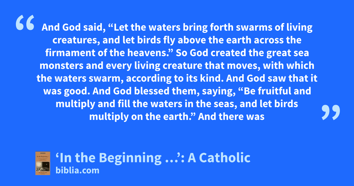 And God said, “Let the waters bring forth swarms of living creatures, and let birds fly above the earth across the firmament of the heavens.” So God created the great sea monsters and every living creature that moves, with which the waters swarm, according to its kind. And God saw that it was good. And God blessed them, saying, “Be fruitful and multiply and fill the waters in the seas, and let birds multiply on the earth.” And there was