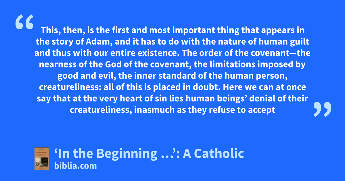 This, then, is the first and most important thing that appears in the story of Adam, and it has to do with the nature of human guilt and thus with our entire existence. The order of the covenant—the nearness of the God of the covenant, the limitations imposed by good and evil, the inner standard of the human person, creatureliness: all of this is placed in doubt. Here we can at once say that at the very heart of sin lies human beings’ denial of their creatureliness, inasmuch as they refuse to accept