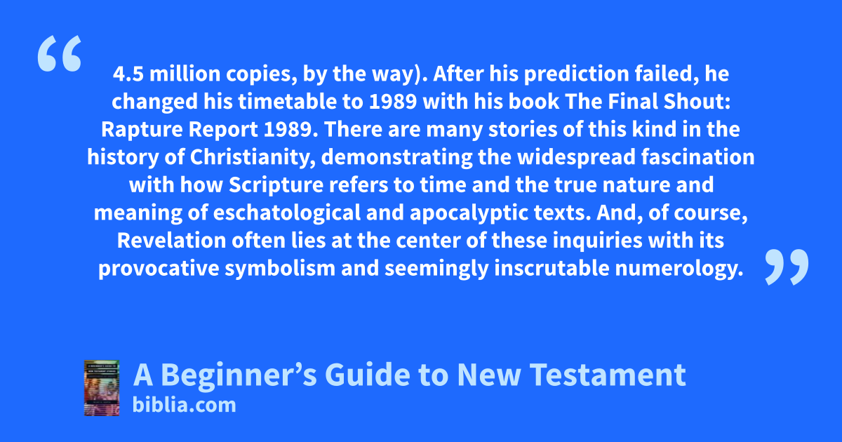 4.5 million copies, by the way). After his prediction failed, he changed his timetable to 1989 with his book The Final Shout: Rapture Report 1989. There are many stories of this kind in the history of Christianity, demonstrating the widespread fascination with how Scripture refers to time and the true nature and meaning of eschatological and apocalyptic texts. And, of course, Revelation often lies at the center of these inquiries with its provocative symbolism and seemingly inscrutable numerology.