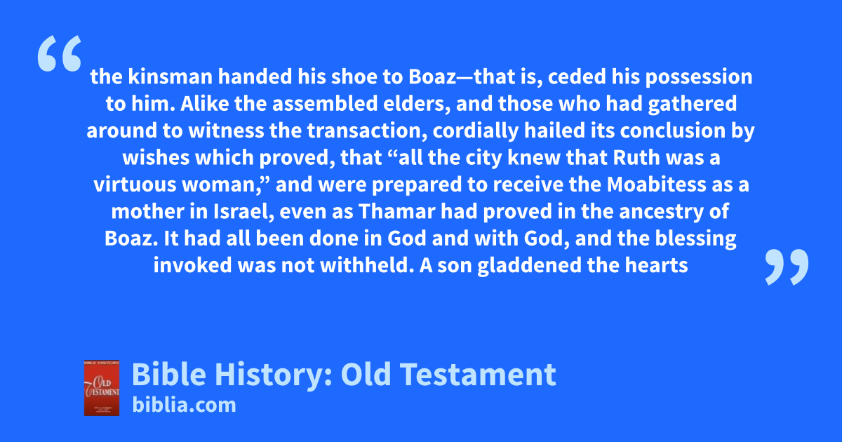 the kinsman handed his shoe to Boaz—that is, ceded his possession to him. Alike the assembled elders, and those who had gathered around to witness the transaction, cordially hailed its conclusion by wishes which proved, that “all the city knew that Ruth was a virtuous woman,” and were prepared to receive the Moabitess as a mother in Israel, even as Thamar had proved in the ancestry of Boaz. It had all been done in God and with God, and the blessing invoked was not withheld. A son gladdened the hearts