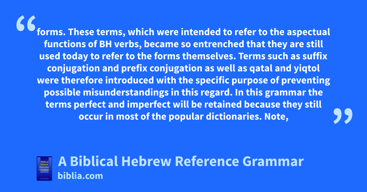 forms. These terms, which were intended to refer to the aspectual functions of BH verbs, became so entrenched that they are still used today to refer to the forms themselves. Terms such as suffix conjugation and prefix conjugation as well as qatal and yiqtol were therefore introduced with the specific purpose of preventing possible misunderstandings in this regard. In this grammar the terms perfect and imperfect will be retained because they still occur in most of the popular dictionaries. Note,