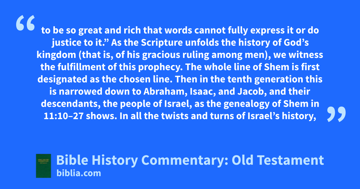 to be so great and rich that words cannot fully express it or do justice to it.” As the Scripture unfolds the history of God’s kingdom (that is, of his gracious ruling among men), we witness the fulfillment of this prophecy. The whole line of Shem is first designated as the chosen line. Then in the tenth generation this is narrowed down to Abraham, Isaac, and Jacob, and their descendants, the people of Israel, as the genealogy of Shem in 11:10–27 shows. In all the twists and turns of Israel’s history,