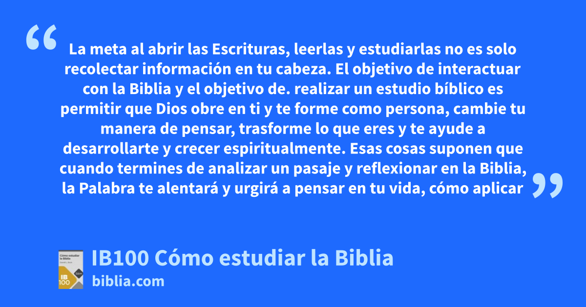 La meta al abrir las Escrituras, leerlas y estudiarlas no es solo recolectar información en tu cabeza. El objetivo de interactuar con la Biblia y el objetivo de. realizar un estudio bíblico es permitir que Dios obre en ti y te forme como persona, cambie tu manera de pensar, trasforme lo que eres y te ayude a desarrollarte y crecer espiritualmente. Esas cosas suponen que cuando termines de analizar un pasaje y reflexionar en la Biblia, la Palabra te alentará y urgirá a pensar en tu vida, cómo aplicar