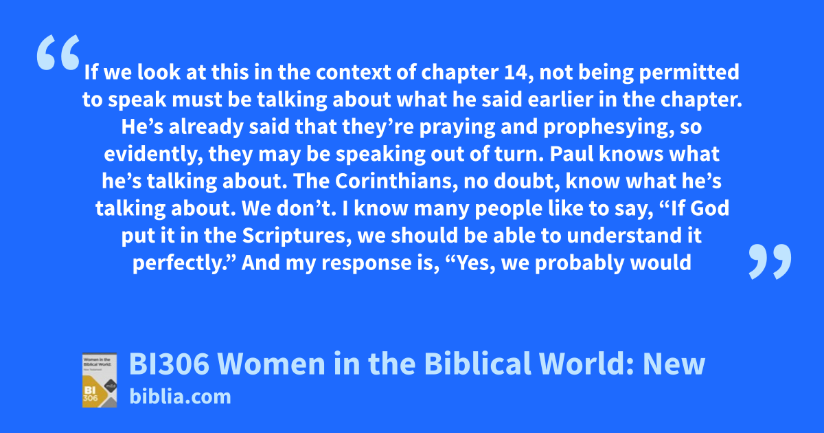 If we look at this in the context of chapter 14, not being permitted to speak must be talking about what he said earlier in the chapter. He’s already said that they’re praying and prophesying, so evidently, they may be speaking out of turn. Paul knows what he’s talking about. The Corinthians, no doubt, know what he’s talking about. We don’t. I know many people like to say, “If God put it in the Scriptures, we should be able to understand it perfectly.” And my response is, “Yes, we probably would