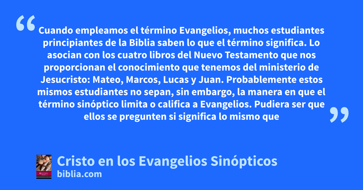 Cuando empleamos el término Evangelios, muchos estudiantes principiantes de la Biblia saben lo que el término significa. Lo asocian con los cuatro libros del Nuevo Testamento que nos proporcionan el conocimiento que tenemos del ministerio de Jesucristo: Mateo, Marcos, Lucas y Juan. Probablemente estos mismos estudiantes no sepan, sin embargo, la manera en que el término sinóptico limita o califica a Evangelios. Pudiera ser que ellos se pregunten si significa lo mismo que