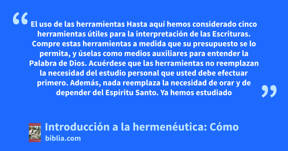 El uso de las herramientas Hasta aquí hemos considerado cinco herramientas útiles para la interpretación de las Escrituras. Compre estas herramientas a medida que su presupuesto se lo permita, y úselas como medios auxiliares para entender la Palabra de Dios. Acuérdese que las herramientas no reemplazan la necesidad del estudio personal que usted debe efectuar primero. Además, nada reemplaza la necesidad de orar y de depender del Espíritu Santo. Ya hemos estudiado