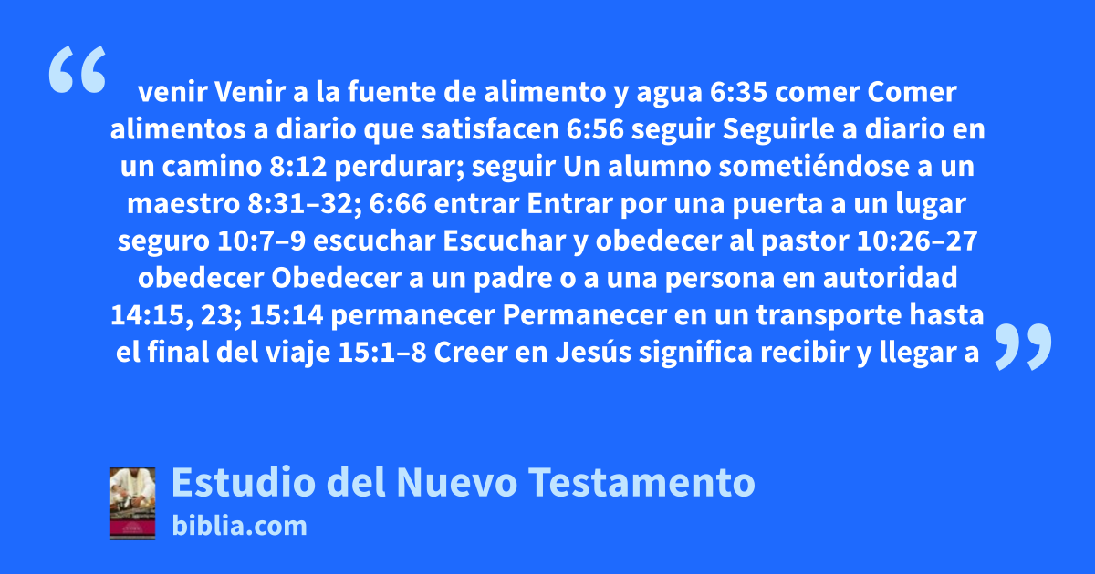 venir Venir a la fuente de alimento y agua 6:35 comer Comer alimentos a diario que satisfacen 6:56 seguir Seguirle a diario en un camino 8:12 perdurar; seguir Un alumno sometiéndose a un maestro 8:31–32; 6:66 entrar Entrar por una puerta a un lugar seguro 10:7–9 escuchar Escuchar y obedecer al pastor 10:26–27 obedecer Obedecer a un padre o a una persona en autoridad 14:15, 23; 15:14 permanecer Permanecer en un transporte hasta el final del viaje 15:1–8 Creer en Jesús significa recibir y llegar a