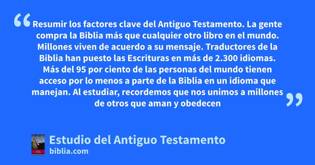 Resumir los factores clave del Antiguo Testamento. La gente compra la Biblia más que cualquier otro libro en el mundo. Millones viven de acuerdo a su mensaje. Traductores de la Biblia han puesto las Escrituras en más de 2.300 idiomas. Más del 95 por ciento de las personas del mundo tienen acceso por lo menos a parte de la Biblia en un idioma que manejan. Al estudiar, recordemos que nos unimos a millones de otros que aman y obedecen