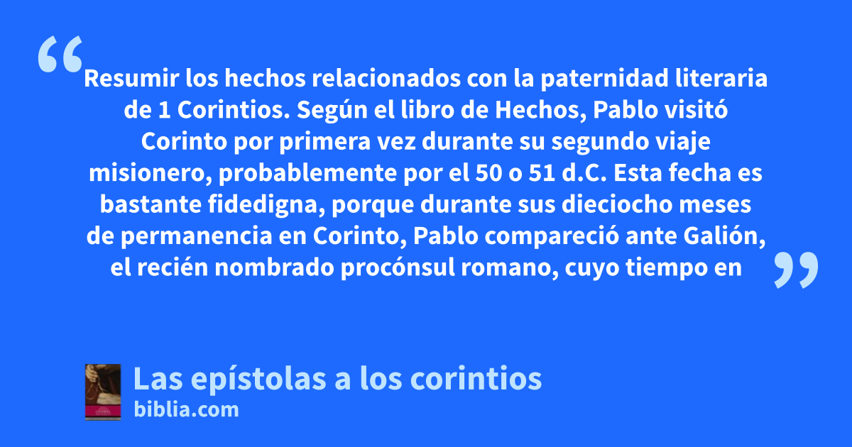 Resumir los hechos relacionados con la paternidad literaria de 1 Corintios. Según el libro de Hechos, Pablo visitó Corinto por primera vez durante su segundo viaje misionero, probablemente por el 50 o 51 d.C. Esta fecha es bastante fidedigna, porque durante sus dieciocho meses de permanencia en Corinto, Pablo compareció ante Galión, el recién nombrado procónsul romano, cuyo tiempo en