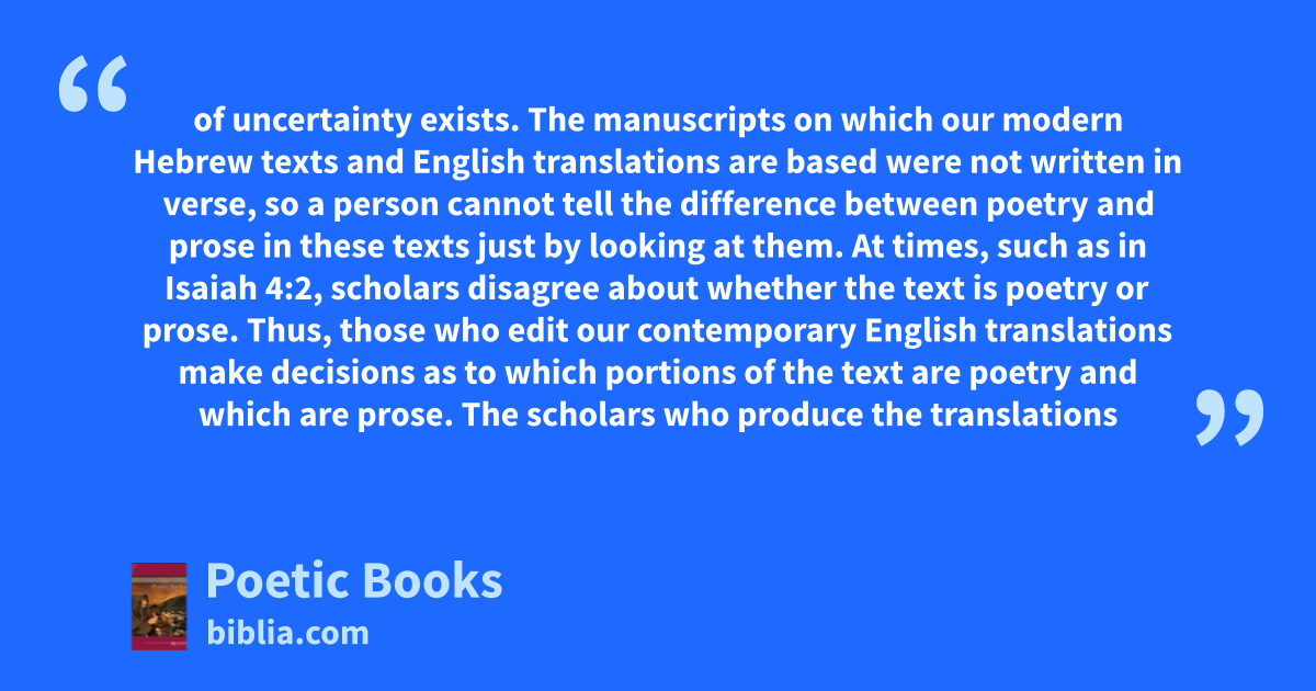 of uncertainty exists. The manuscripts on which our modern Hebrew texts and English translations are based were not written in verse, so a person cannot tell the difference between poetry and prose in these texts just by looking at them. At times, such as in Isaiah 4:2, scholars disagree about whether the text is poetry or prose. Thus, those who edit our contemporary English translations make decisions as to which portions of the text are poetry and which are prose. The scholars who produce the translations