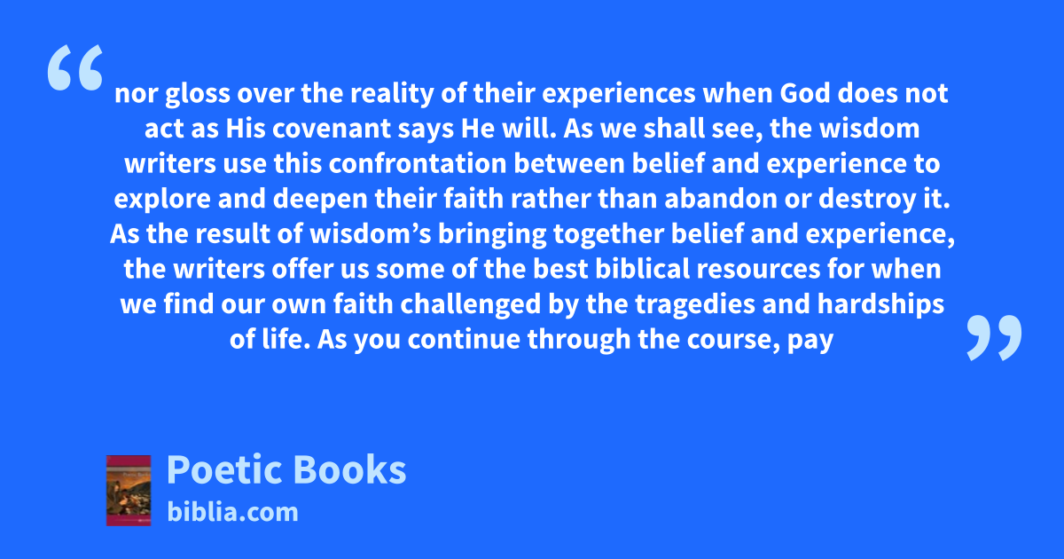nor gloss over the reality of their experiences when God does not act as His covenant says He will. As we shall see, the wisdom writers use this confrontation between belief and experience to explore and deepen their faith rather than abandon or destroy it. As the result of wisdom’s bringing together belief and experience, the writers offer us some of the best biblical resources for when we find our own faith challenged by the tragedies and hardships of life. As you continue through the course, pay