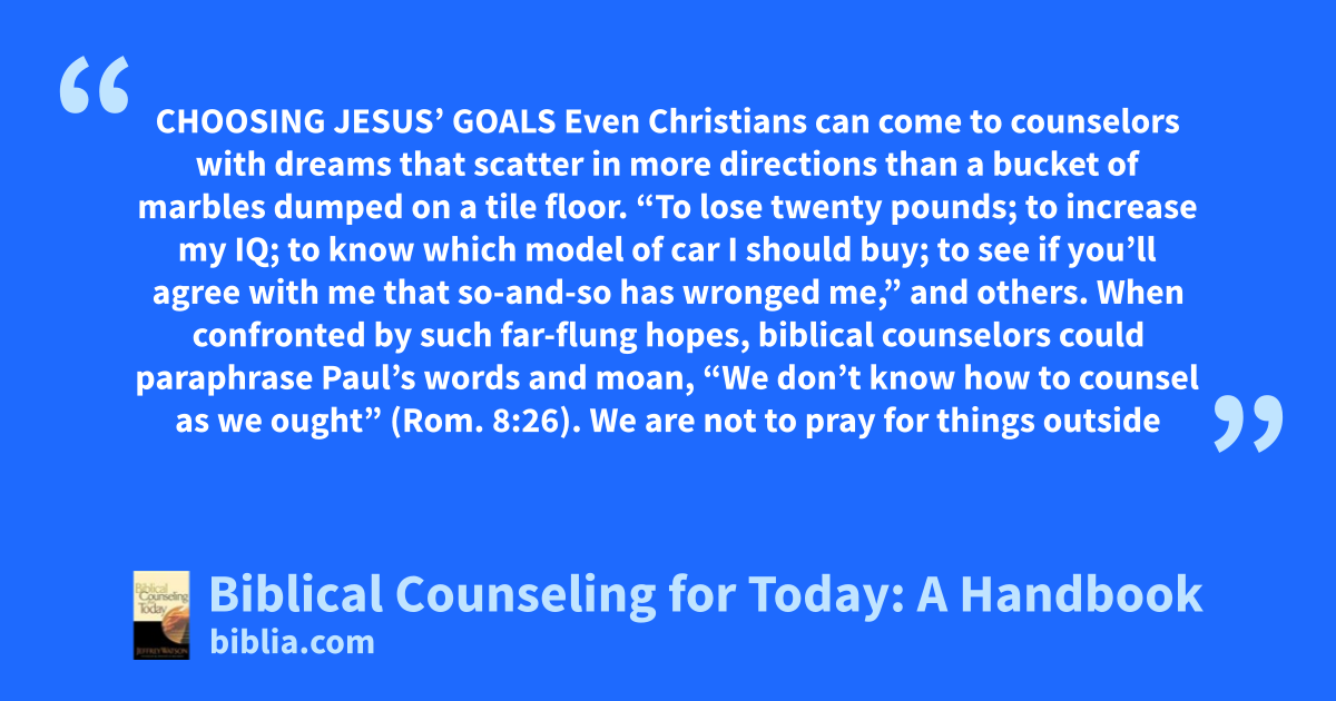 CHOOSING JESUS’ GOALS Even Christians can come to counselors with dreams that scatter in more directions than a bucket of marbles dumped on a tile floor. “To lose twenty pounds; to increase my IQ; to know which model of car I should buy; to see if you’ll agree with me that so-and-so has wronged me,” and others. When confronted by such far-flung hopes, biblical counselors could paraphrase Paul’s words and moan, “We don’t know how to counsel as we ought” (Rom. 8:26). We are not to pray for things outside