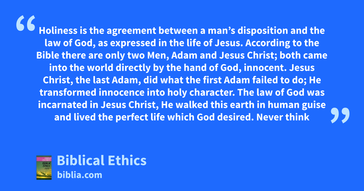 Holiness is the agreement between a man’s disposition and the law of God, as expressed in the life of Jesus. According to the Bible there are only two Men, Adam and Jesus Christ; both came into the world directly by the hand of God, innocent. Jesus Christ, the last Adam, did what the first Adam failed to do; He transformed innocence into holy character. The law of God was incarnated in Jesus Christ, He walked this earth in human guise and lived the perfect life which God desired. Never think