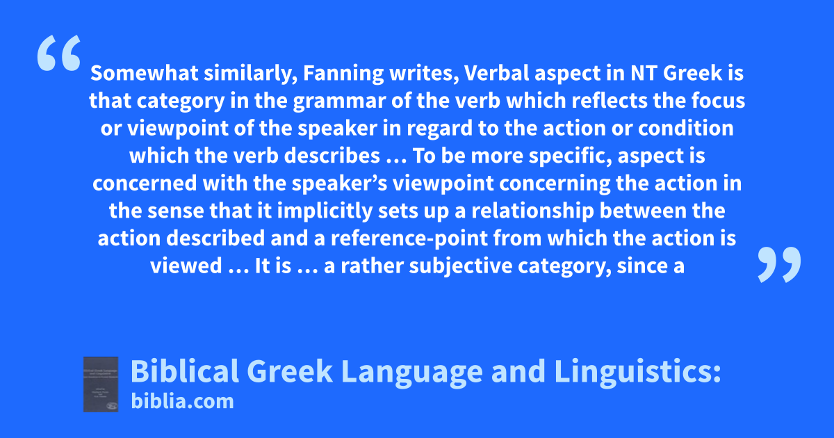 Somewhat similarly, Fanning writes, Verbal aspect in NT Greek is that category in the grammar of the verb which reflects the focus or viewpoint of the speaker in regard to the action or condition which the verb describes … To be more specific, aspect is concerned with the speaker’s viewpoint concerning the action in the sense that it implicitly sets up a relationship between the action described and a reference-point from which the action is viewed … It is … a rather subjective category, since a