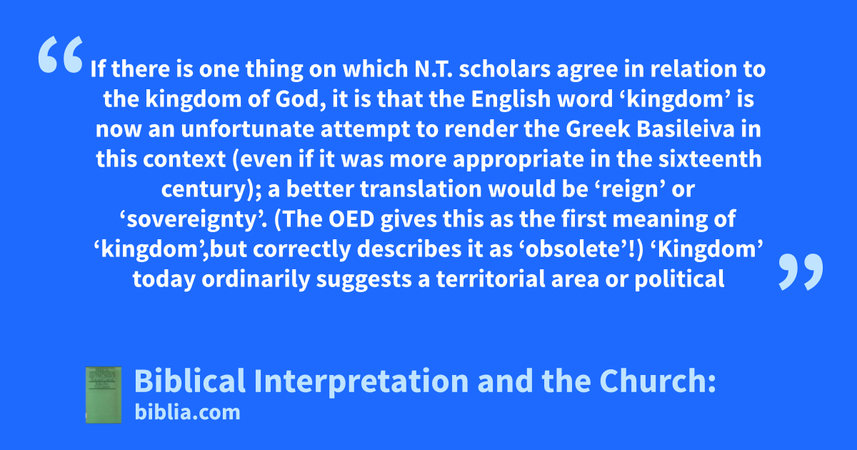 If there is one thing on which N.T. scholars agree in relation to the kingdom of God, it is that the English word ‘kingdom’ is now an unfortunate attempt to render the Greek Basileiva in this context (even if it was more appropriate in the sixteenth century); a better translation would be ‘reign’ or ‘sovereignty’. (The OED gives this as the first meaning of ‘kingdom’,but correctly describes it as ‘obsolete’!) ‘Kingdom’ today ordinarily suggests a territorial area or political