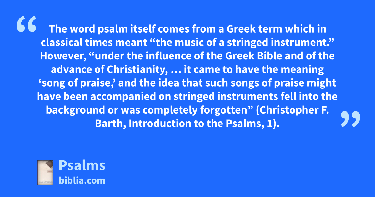 The word psalm itself comes from a Greek term which in classical times meant “the music of a stringed instrument.” However, “under the influence of the Greek Bible and of the advance of Christianity, … it came to have the meaning ‘song of praise,’ and the idea that such songs of praise might have been accompanied on stringed instruments fell into the background or was completely forgotten” (Christopher F. Barth, Introduction to the Psalms, 1).