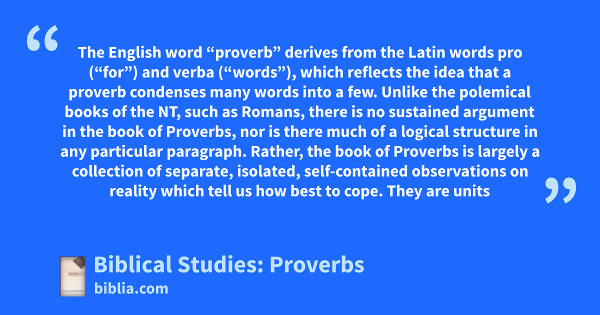 The English word “proverb” derives from the Latin words pro (“for”) and verba (“words”), which reflects the idea that a proverb condenses many words into a few. Unlike the polemical books of the NT, such as Romans, there is no sustained argument in the book of Proverbs, nor is there much of a logical structure in any particular paragraph. Rather, the book of Proverbs is largely a collection of separate, isolated, self-contained observations on reality which tell us how best to cope. They are units