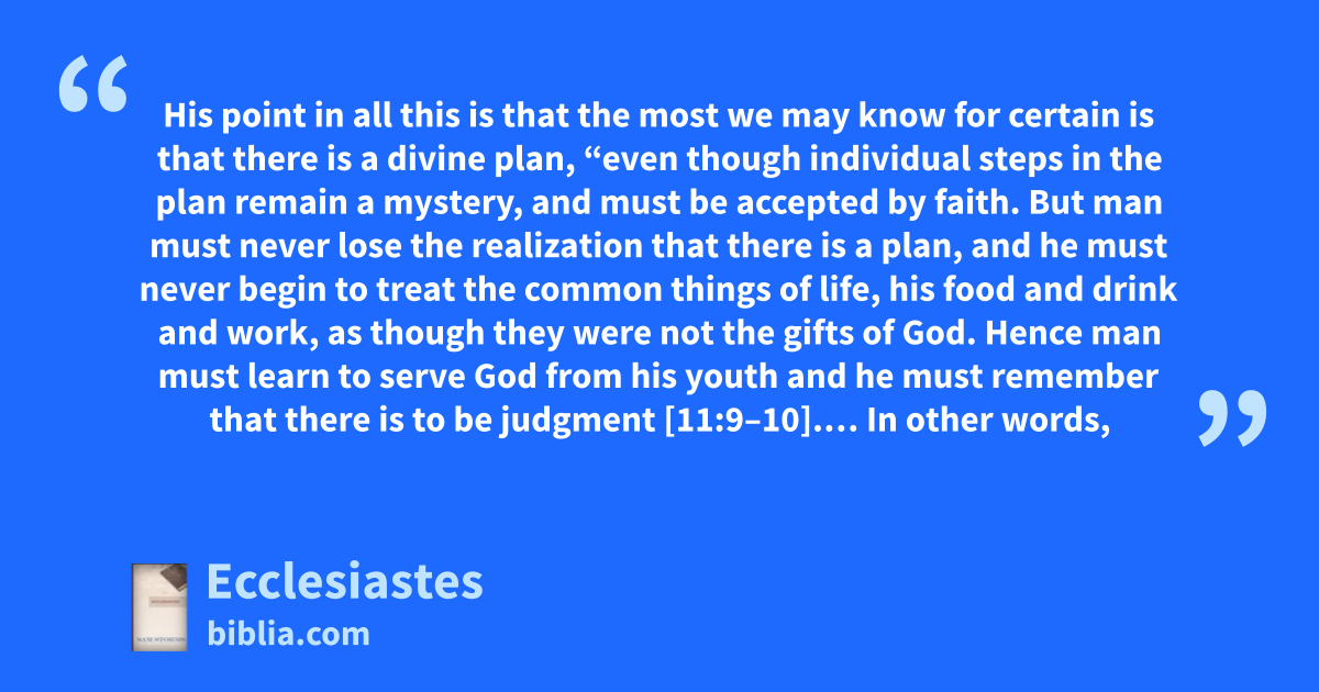 His point in all this is that the most we may know for certain is that there is a divine plan, “even though individual steps in the plan remain a mystery, and must be accepted by faith. But man must never lose the realization that there is a plan, and he must never begin to treat the common things of life, his food and drink and work, as though they were not the gifts of God. Hence man must learn to serve God from his youth and he must remember that there is to be judgment [11:9–10].… In other words,