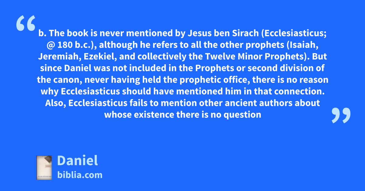 b. The book is never mentioned by Jesus ben Sirach (Ecclesiasticus; @ 180 b.c.), although he refers to all the other prophets (Isaiah, Jeremiah, Ezekiel, and collectively the Twelve Minor Prophets). But since Daniel was not included in the Prophets or second division of the canon, never having held the prophetic office, there is no reason why Ecclesiasticus should have mentioned him in that connection. Also, Ecclesiasticus fails to mention other ancient authors about whose existence there is no question