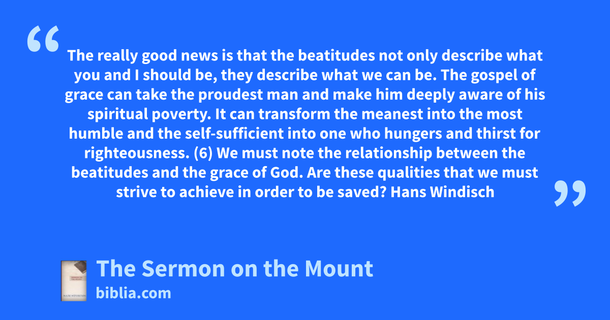 The really good news is that the beatitudes not only describe what you and I should be, they describe what we can be. The gospel of grace can take the proudest man and make him deeply aware of his spiritual poverty. It can transform the meanest into the most humble and the self-sufficient into one who hungers and thirst for righteousness. (6) We must note the relationship between the beatitudes and the grace of God. Are these qualities that we must strive to achieve in order to be saved? Hans Windisch