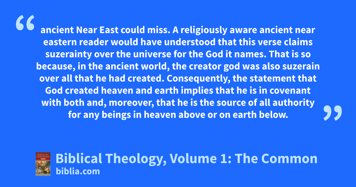ancient Near East could miss. A religiously aware ancient near eastern reader would have understood that this verse claims suzerainty over the universe for the God it names. That is so because, in the ancient world, the creator god was also suzerain over all that he had created. Consequently, the statement that God created heaven and earth implies that he is in covenant with both and, moreover, that he is the source of all authority for any beings in heaven above or on earth below.