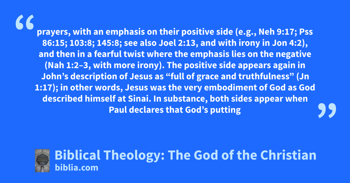 prayers, with an emphasis on their positive side (e.g., Neh 9:17; Pss 86:15; 103:8; 145:8; see also Joel 2:13, and with irony in Jon 4:2), and then in a fearful twist where the emphasis lies on the negative (Nah 1:2–3, with more irony). The positive side appears again in John’s description of Jesus as “full of grace and truthfulness” (Jn 1:17); in other words, Jesus was the very embodiment of God as God described himself at Sinai. In substance, both sides appear when Paul declares that God’s putting