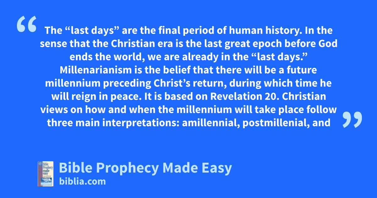 The “last days” are the final period of human history. In the sense that the Christian era is the last great epoch before God ends the world, we are already in the “last days.” Millenarianism is the belief that there will be a future millennium preceding Christ’s return, during which time he will reign in peace. It is based on Revelation 20. Christian views on how and when the millennium will take place follow three main interpretations: amillennial, postmillenial, and