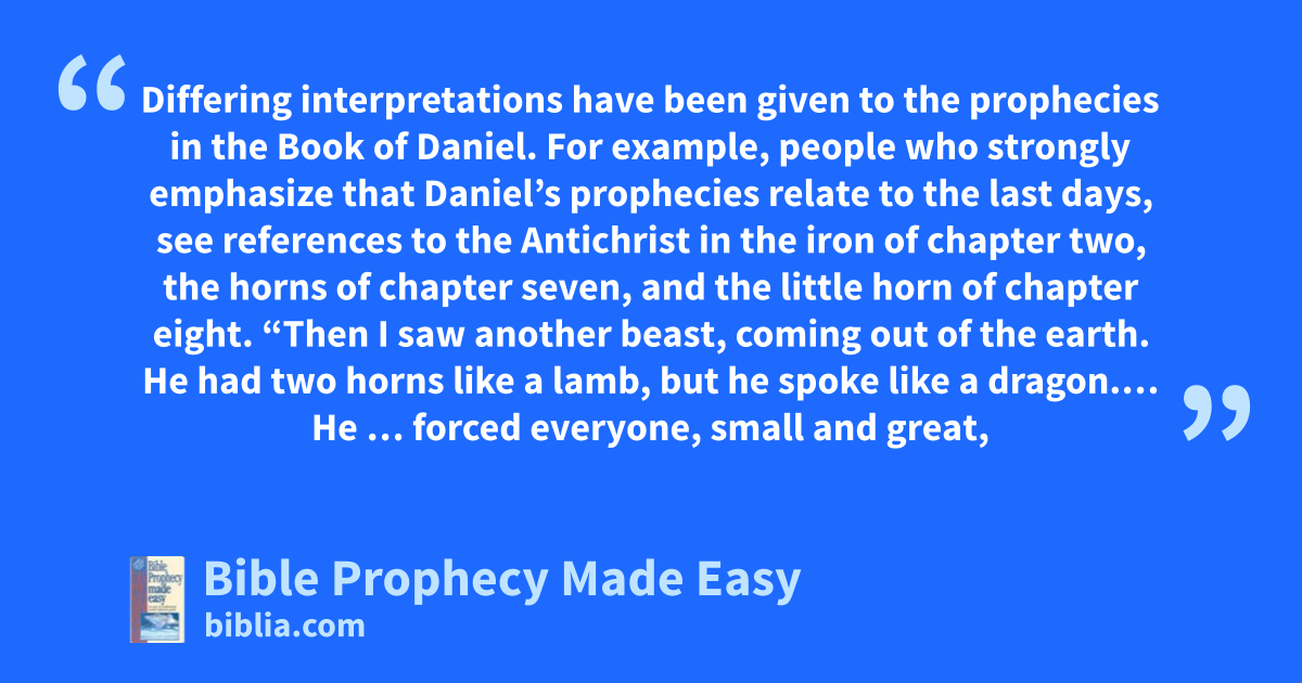 Differing interpretations have been given to the prophecies in the Book of Daniel. For example, people who strongly emphasize that Daniel’s prophecies relate to the last days, see references to the Antichrist in the iron of chapter two, the horns of chapter seven, and the little horn of chapter eight. “Then I saw another beast, coming out of the earth. He had two horns like a lamb, but he spoke like a dragon.… He … forced everyone, small and great,