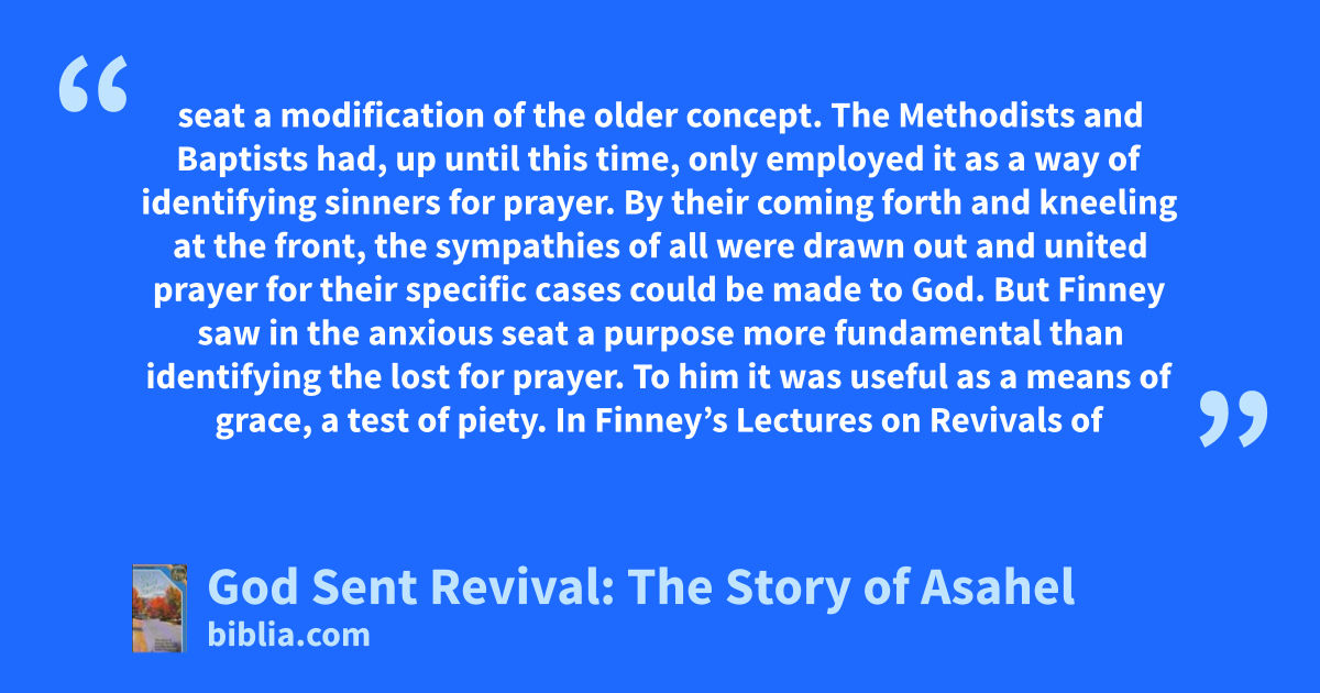 seat a modification of the older concept. The Methodists and Baptists had, up until this time, only employed it as a way of identifying sinners for prayer. By their coming forth and kneeling at the front, the sympathies of all were drawn out and united prayer for their specific cases could be made to God. But Finney saw in the anxious seat a purpose more fundamental than identifying the lost for prayer. To him it was useful as a means of grace, a test of piety. In Finney’s Lectures on Revivals of