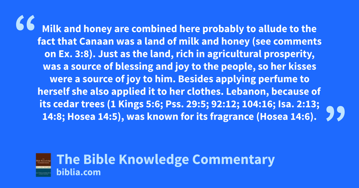 Milk and honey are combined here probably to allude to the fact that Canaan was a land of milk and honey (see comments on Ex. 3:8). Just as the land, rich in agricultural prosperity, was a source of blessing and joy to the people, so her kisses were a source of joy to him. Besides applying perfume to herself she also applied it to her clothes. Lebanon, because of its cedar trees (1 Kings 5:6; Pss. 29:5; 92:12; 104:16; Isa. 2:13; 14:8; Hosea 14:5), was known for its fragrance (Hosea 14:6).