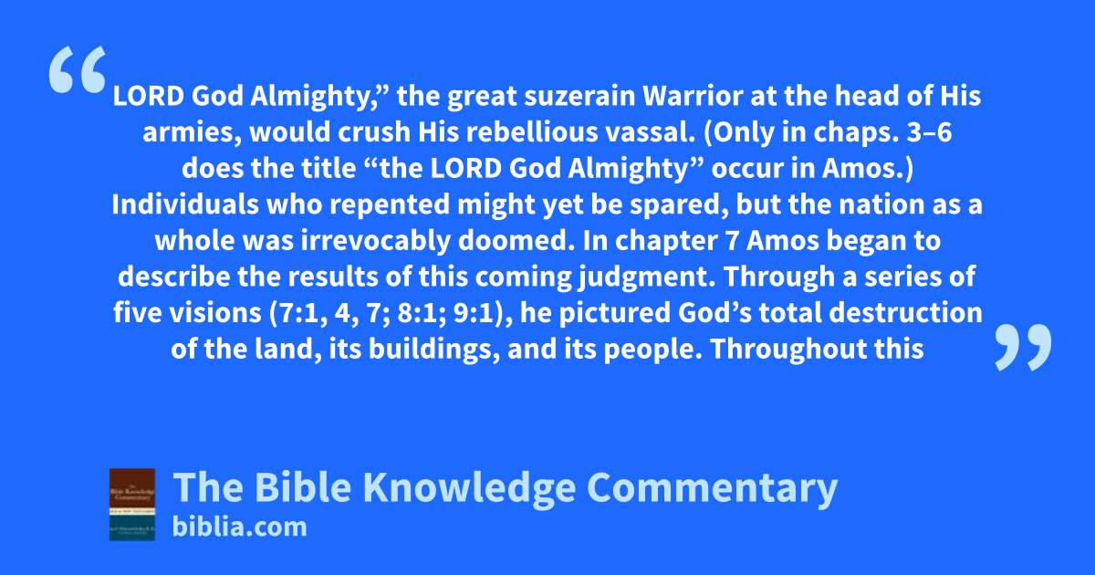 LORD God Almighty,” the great suzerain Warrior at the head of His armies, would crush His rebellious vassal. (Only in chaps. 3–6 does the title “the LORD God Almighty” occur in Amos.) Individuals who repented might yet be spared, but the nation as a whole was irrevocably doomed. In chapter 7 Amos began to describe the results of this coming judgment. Through a series of five visions (7:1, 4, 7; 8:1; 9:1), he pictured God’s total destruction of the land, its buildings, and its people. Throughout this