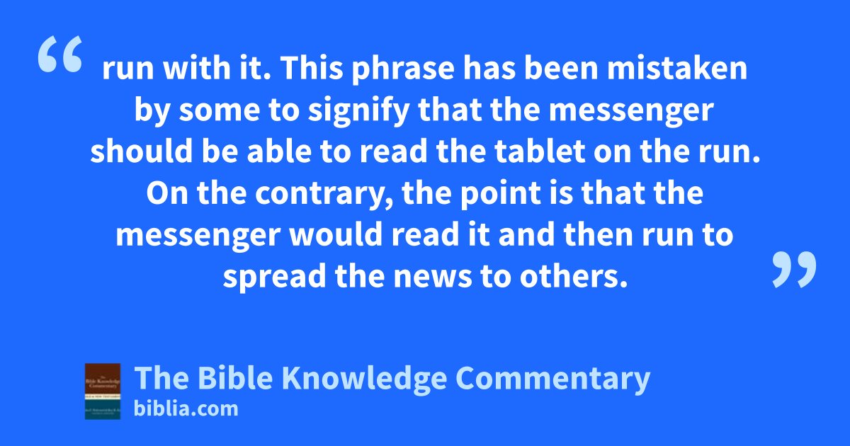 run with it. This phrase has been mistaken by some to signify that the messenger should be able to read the tablet on the run. On the contrary, the point is that the messenger would read it and then run to spread the news to others.
