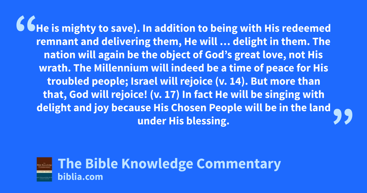 He is mighty to save). In addition to being with His redeemed remnant and delivering them, He will … delight in them. The nation will again be the object of God’s great love, not His wrath. The Millennium will indeed be a time of peace for His troubled people; Israel will rejoice (v. 14). But more than that, God will rejoice! (v. 17) In fact He will be singing with delight and joy because His Chosen People will be in the land under His blessing.