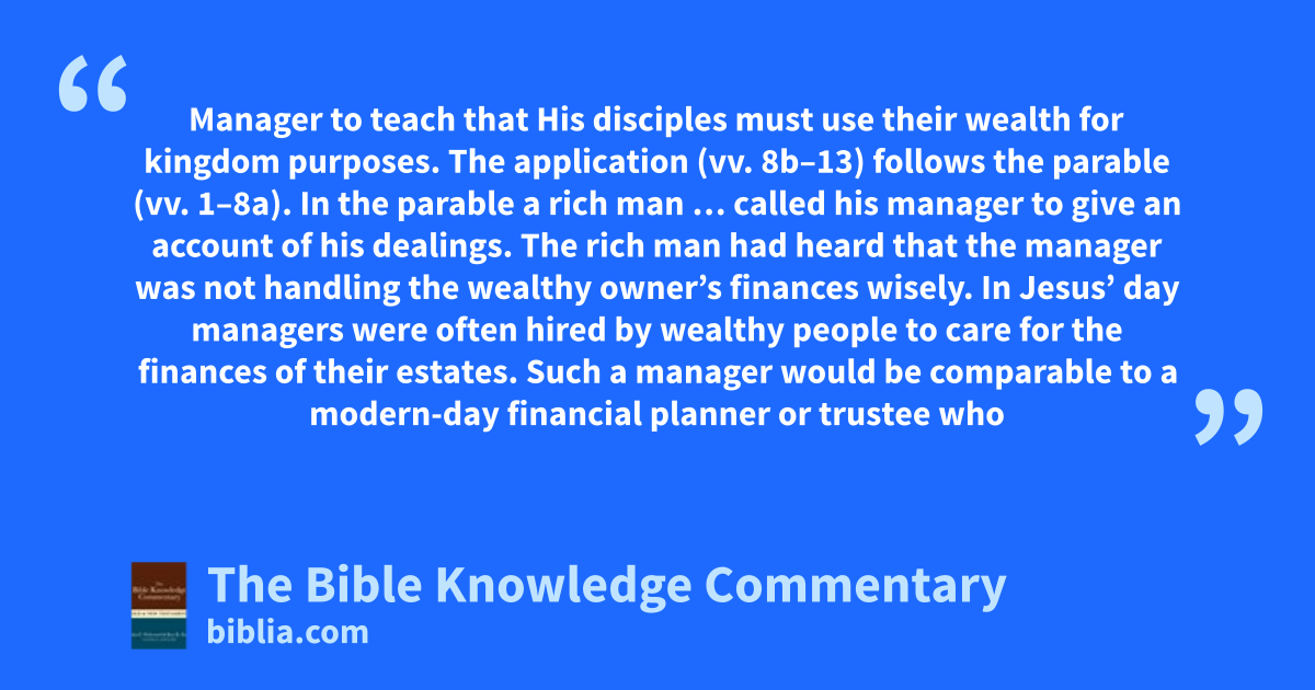 Manager to teach that His disciples must use their wealth for kingdom purposes. The application (vv. 8b–13) follows the parable (vv. 1–8a). In the parable a rich man … called his manager to give an account of his dealings. The rich man had heard that the manager was not handling the wealthy owner’s finances wisely. In Jesus’ day managers were often hired by wealthy people to care for the finances of their estates. Such a manager would be comparable to a modern-day financial planner or trustee who