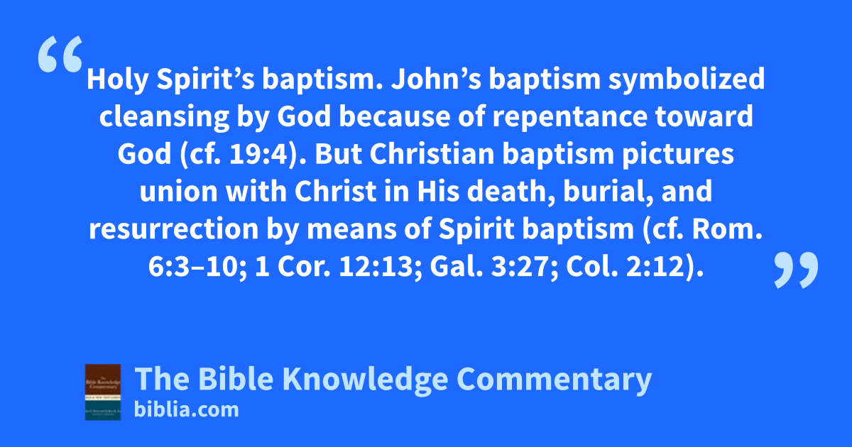 Holy Spirit’s baptism. John’s baptism symbolized cleansing by God because of repentance toward God (cf. 19:4). But Christian baptism pictures union with Christ in His death, burial, and resurrection by means of Spirit baptism (cf. Rom. 6:3–10; 1 Cor. 12:13; Gal. 3:27; Col. 2:12).