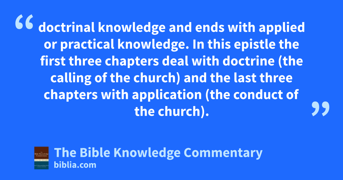 doctrinal knowledge and ends with applied or practical knowledge. In this epistle the first three chapters deal with doctrine (the calling of the church) and the last three chapters with application (the conduct of the church).