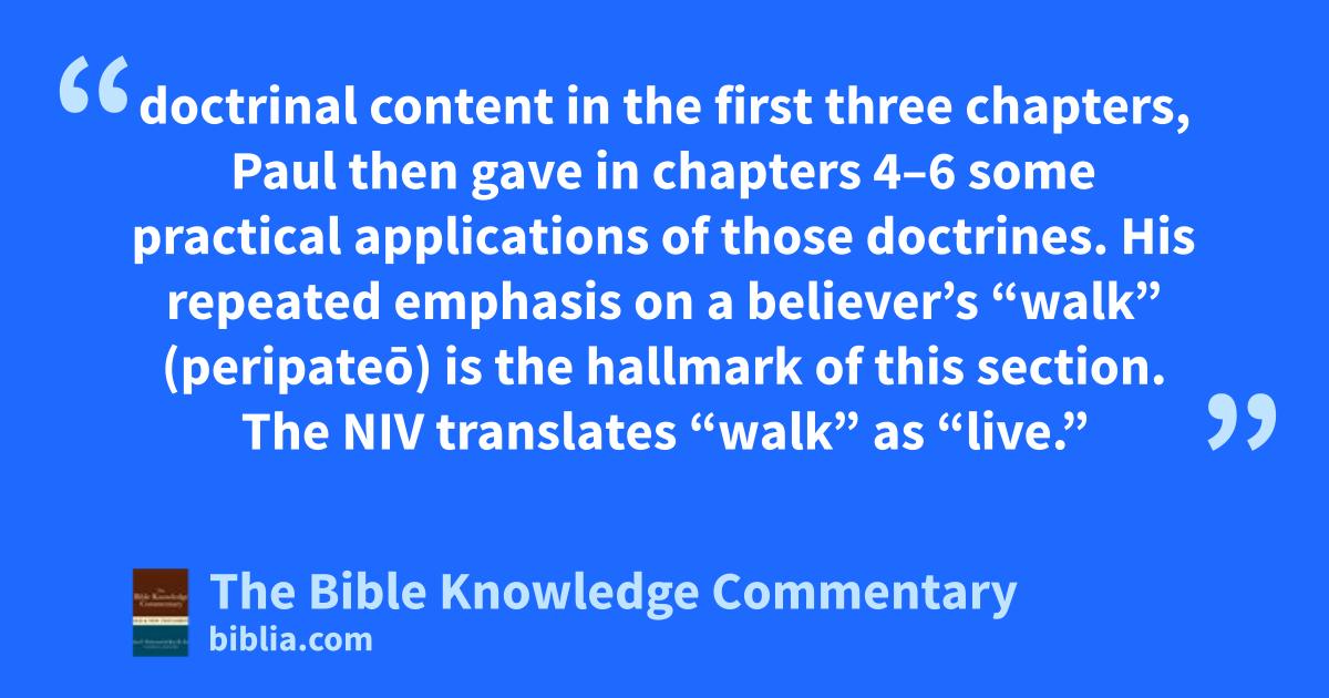 doctrinal content in the first three chapters, Paul then gave in chapters 4–6 some practical applications of those doctrines. His repeated emphasis on a believer’s “walk” (peripateō) is the hallmark of this section. The NIV translates “walk” as “live.”