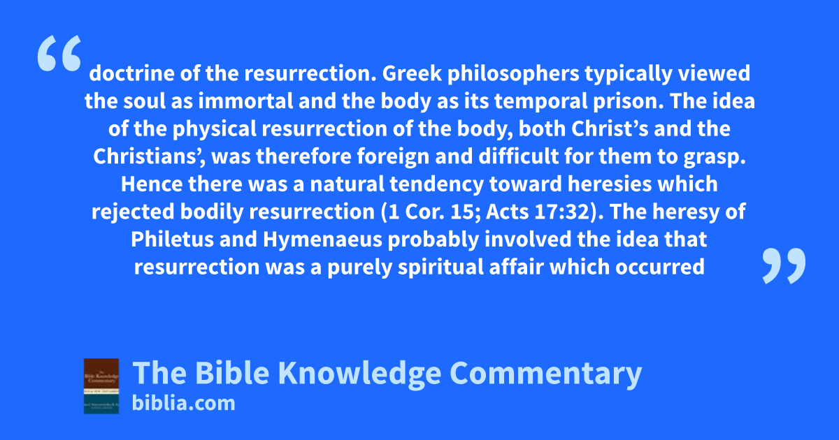 doctrine of the resurrection. Greek philosophers typically viewed the soul as immortal and the body as its temporal prison. The idea of the physical resurrection of the body, both Christ’s and the Christians’, was therefore foreign and difficult for them to grasp. Hence there was a natural tendency toward heresies which rejected bodily resurrection (1 Cor. 15; Acts 17:32). The heresy of Philetus and Hymenaeus probably involved the idea that resurrection was a purely spiritual affair which occurred
