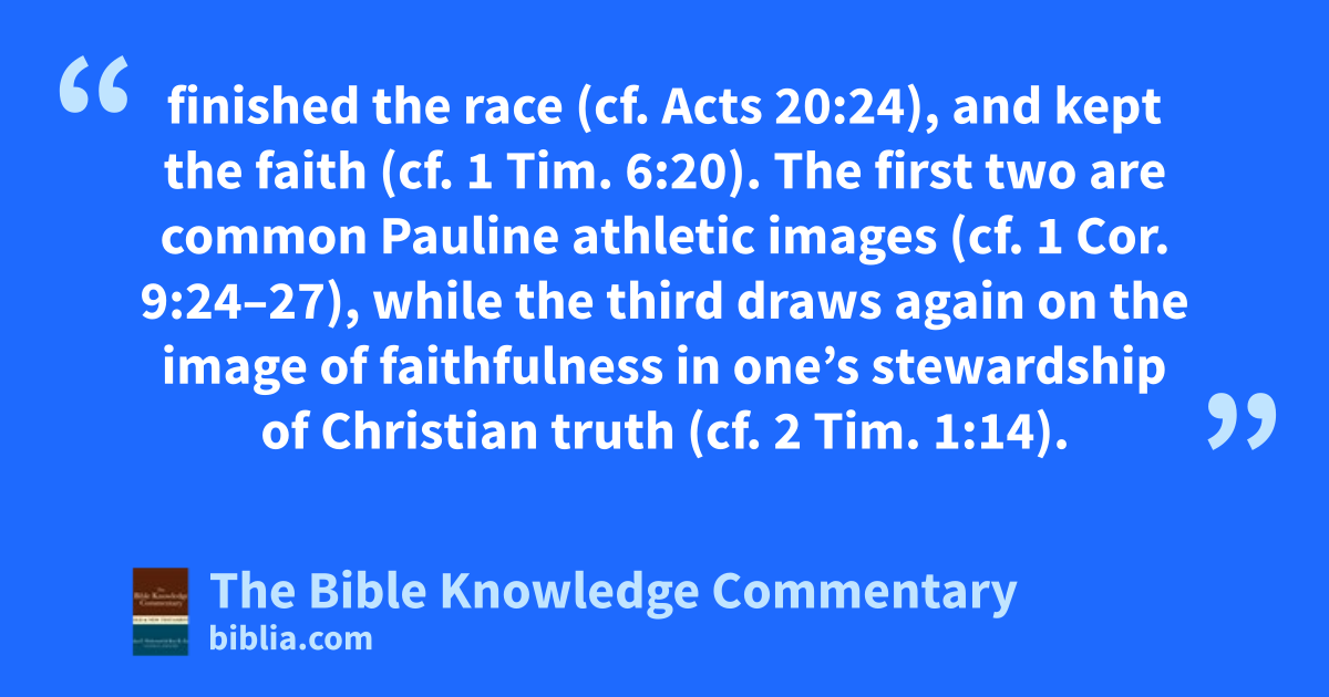 finished the race (cf. Acts 20:24), and kept the faith (cf. 1 Tim. 6:20). The first two are common Pauline athletic images (cf. 1 Cor. 9:24–27), while the third draws again on the image of faithfulness in one’s stewardship of Christian truth (cf. 2 Tim. 1:14).